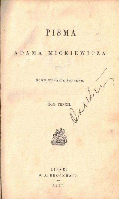 Pisma Adama Mickiewicza. T. 3. - Nowe wydanie zupełne. - Lipsk : F. A. Brockhaus, 1897. - [6], 254 stron ; 18 cm.